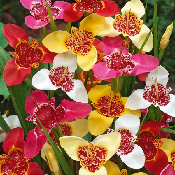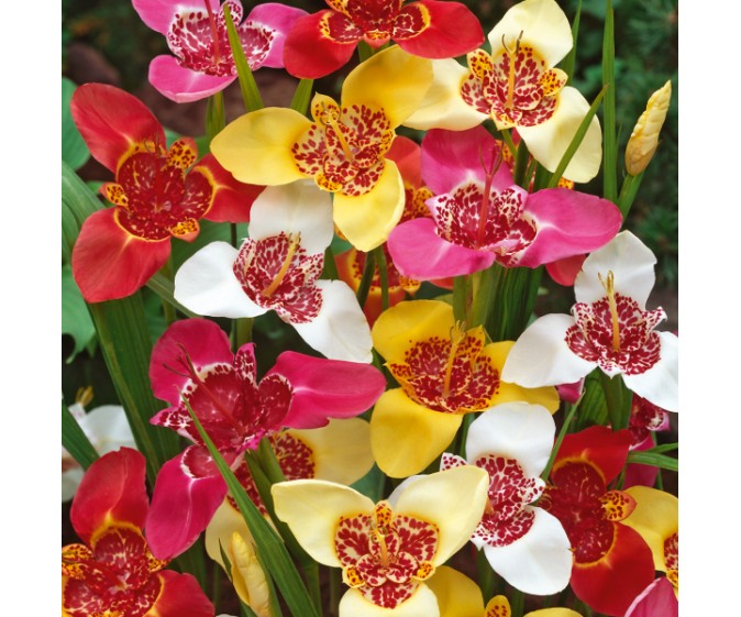 - Tygrysówka mieszanka (Tigridia pavonia) najefektowniej prezentuje się w grupie kilku różnokolorowych odmian. Kwitnie długo, będzie pięknie prezentować się zarówno na letnich rabatach kwiatowych, jak w i dużych donicach na rabatach i balkonach.