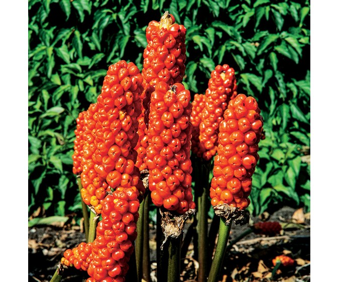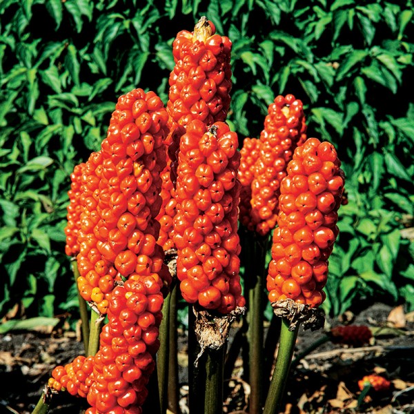Dekoracyjne zarówno w czasie kwitnienia, jak i długo po nim, obrazki włoskie (Arum italicum) to wyjątkowo efektowna roślina ozdobna, która przyciąga wzrok przez większą część sezonu. Jej największym atutem są błyszczące, zielone liście ozdobione jasnym, białawym rysunkiem, które same w sobie stanowią elegancką dekorację ogrodu. Wiosną roślina wytwarza kremowe kwiatostany w formie charakterystycznej kolby, dodające jej subtelnego uroku. Po przekwitnięciu pojawia się kolejny walor ozdobny – intensywnie czerwone, dekoracyjne owoce, które utrzymują się aż do późnej jesieni, wprowadzając wyrazisty akcent kolorystyczny na rabatach, w cienistych zakątkach ogrodu i pod koronami drzew.