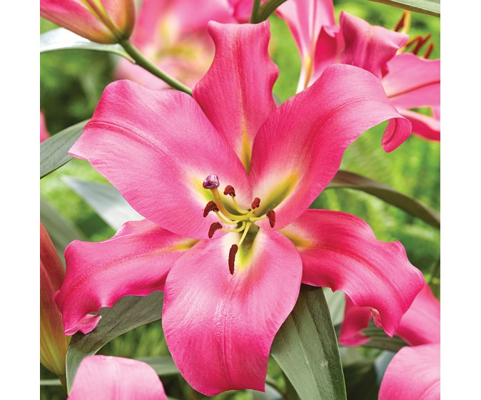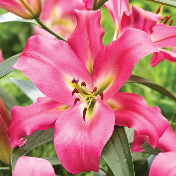 Lilia drzewiasta Maldano (Lilium) to imponująca odmiana, która zachwyca już na pierwszy rzut oka dzięki efektownym, różowym kwiatom z delikatnym biało-zielonym gardłem. Jej kwiaty są duże i okazałe, a cała roślina ma bardzo silny, wyprostowany wzrost, co sprawia, że doskonale nadaje się na centralny punkt rabaty lub jako soliter w ogrodzie. Odmiana Maldano dorasta nawet do 180 cm, a każdy kwiatostan osiąga średnicę 20–25 cm. Kwiaty i łodygi są wysokie i mocne, dzięki czemu roślina prezentuje się niezwykle efektownie i stabilnie. Dodatkowym atutem jest wysoka odporność na choroby, co czyni tę lilię wyjątkowo trwałą i łatwą w uprawie. Z pewnością stanie się jednym z najbardziej przyciągających uwagę elementów w każdym ogrodzie.
