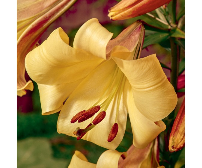 Lilia trąbkowa Golden Splendour (Lilium) to odmiana, która wnosi do ogrodu intensywny, ciepły akcent dzięki swoim dużym, żółtym kwiatom. Jej barwa jest promienna i pełna energii, dlatego świetnie sprawdza się w nasadzeniach blisko miejsc wypoczynku, gdzie można w pełni cieszyć się jej wyjątkowo przyjemnym zapachem. Na jednej łodydze Golden Splendour może wydać nawet do 20 dużych kwiatów, co daje imponujący efekt dekoracyjny. Charakterystyczne, mocno podkręcone płatki dodają kwiatom lekkości i elegancji, dzięki czemu lilia ta prezentuje się wyjątkowo efektownie w bukietach i kompozycjach ciętych.