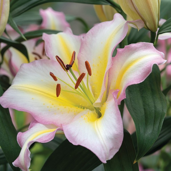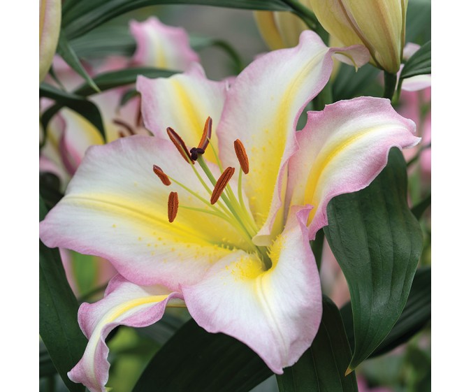 Lilia orientalna Captain Tricolore to wyjątkowa nowość wśród lilii orientalnych, która zachwyca niezwykłą, trójbarwną kolorystyką. Jej kwiaty są delikatnie biało-żółte, a brzegi płatków podkreślone są różowym odcieniem, co tworzy niezwykle elegancki i dekoracyjny efekt. Kwiaty skierowane są ku górze, dzięki czemu prezentują się bardzo efektownie i są doskonale widoczne w rabatach oraz w większych kompozycjach ogrodowych. Roślina wydziela piękny, intensywny zapach, charakterystyczny dla lilii orientalnych, co dodatkowo podnosi jej atrakcyjność jako rośliny ozdobnej oraz kwiat cięty.