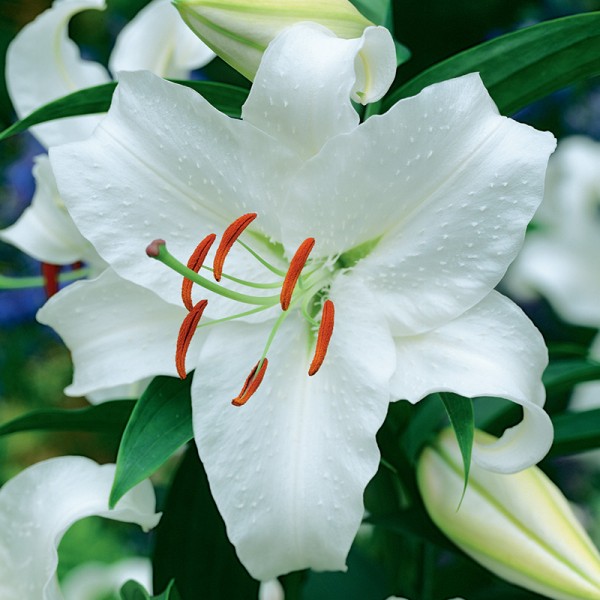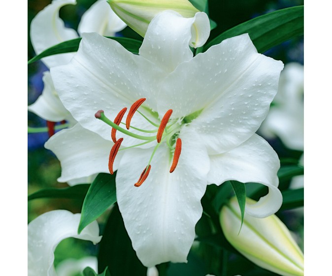 Lilia orientalna Ourasi to wyjątkowo elegancka odmiana lilii, która zachwyca czystością formy i koloru. Jej duże, pojedyncze kwiaty o średnicy około 15–20 cm mają nieskazitelnie śnieżnobiałą barwę, dzięki czemu wyróżniają się na tle innych roślin i wprowadzają do ogrodu wrażenie harmonii, świeżości i klasycznej elegancji. Kwiaty osadzone są wyprostowanie lub lekko skośnie, co dodatkowo podkreśla ich szlachetny charakter i sprawia, że są doskonale widoczne na rabatach oraz w kompozycjach florystycznych. Jej ciemnozielone, lancetowate liście o długości około 10–15 cm, stanowią idealne tło dla jasnych kwiatów i nadają całości zdrowy, energiczny wygląd. Jednolite, czysto białe ubarwienie kwiatów sprawia, że lilia Ourasi prezentuje się niezwykle elegancko zarówno w ogrodzie, jak i jako kwiat cięty. To odmiana o ponadczasowym uroku, doskonała do nowoczesnych i klasycznych aranżacji, ceniona przez miłośników subtelnego piękna i wyrafinowanej prostoty.
