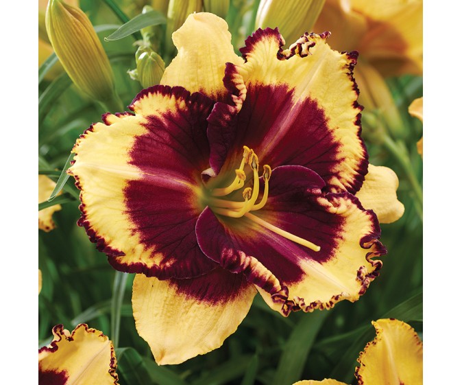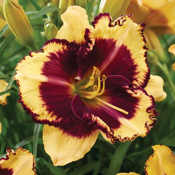 Liliowiec Tiger Blood (Hemerocallis) to odmiana o egzotycznej, nieco drapieżnej urodzie, która natychmiast przyciąga wzrok. Duże kwiaty o średnicy około 15 cm są doskonale widoczne już z daleka i zachwycają kontrastowym zestawieniem barw. Pastelowo-żółte płatki zdobi wyraźne, purpurowe oczko oraz dopasowana kolorystycznie obwódka, tworząc bardzo efektowny i nowoczesny wygląd. Delikatna, falbaniasta krawędź płatków dodaje kwiatom lekkości i dodatkowego uroku. Odmiana Tiger Blood należy do liliowców powtarzających kwitnienie, dzięki czemu cieszy oko przez długi czas w sezonie. Doskonale sprawdzi się na rabatach bylinowych, w nasadzeniach grupowych oraz jako wyrazisty akcent kolorystyczny w ogrodzie.