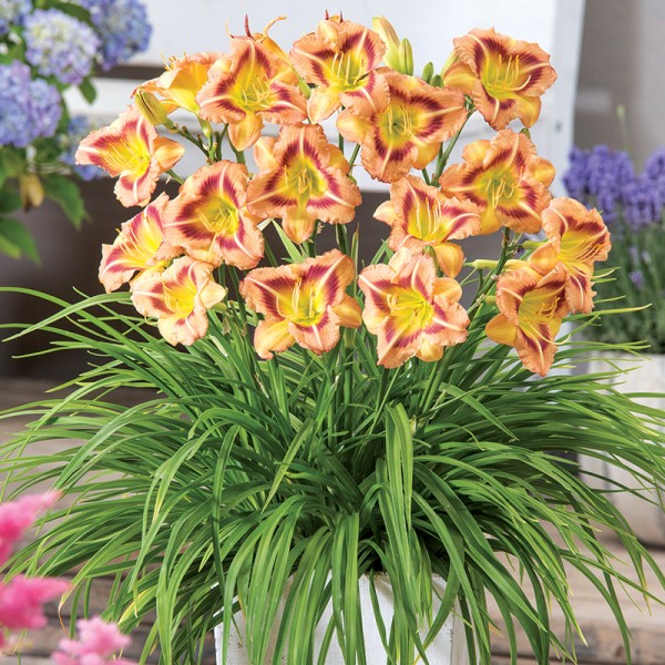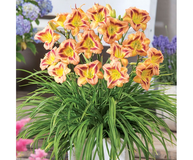 London Eye® to niska odmiana, która czaruje efektownymi, kielichowatymi kwiatami o ciekawym, morelowo-czerwono-żółtym ubarwieniu. Niebywale dekoracyjna bylina, obok której nie sposób przejść obojętnie. Długie, spektakularne, niezwykle obfite kwitnienie, przepiękne barwy, atrakcyjna sylwetka oraz niewielkie wymagania uprawowe sprawiają, że cieszy się ona ogromną popularnością. Kwitnie obficie od czerwca do lipca.