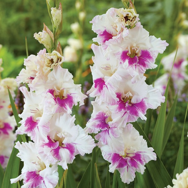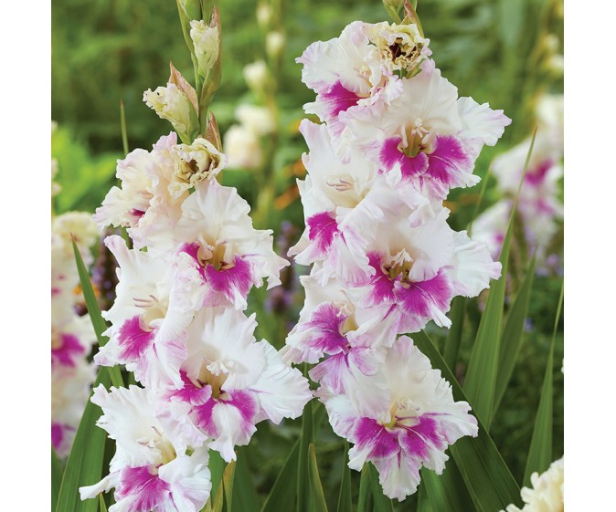 Mieczyk Amber Mistique (Gladiolus) to wyjątkowa odmiana, która wnosi do ogrodu urzekającą letnią elegancję. Wysokie, smukłe łodygi latem wznoszą się niczym falbaniaste różdżki, ozdobione promiennymi, kremowymi kwiatami z charakterystyczną, gwiaździstą plamą w kolorze czarnej porzeczki w centrum każdego kwiatu, nadając całej kompozycji subtelny, magiczny blask. Ta świetlista odmiana doskonale komponuje się zarówno w romantycznych, wiejskich rabatach, jak i w formalnych, nowoczesnych aranżacjach ogrodowych czy miejskich patio. Dzięki mocnym, długim łodygom mieczyki Amber Mistique są także znakomitym kwiatem ciętym – sprawdzą się w bukietach i dekoracjach florystycznych, zachowując świeżość przez długi czas.