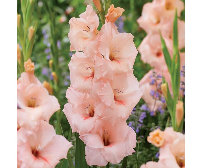 Mieczyk Apricot Beauty (Gladiolus) to niezwykle elegancka odmiana mieczyka wielkokwiatowego, ceniona za subtelną, ciepłą kolorystykę kwiatów w odcieniach moreli, brzoskwini i delikatnego różu. Duże, aksamitne kwiaty tworzą gęste, kłosowate kwiatostany, które nadają rabatom lekkości i romantycznego charakteru. Roślina osiąga wysokość około 100–120 cm i kwitnie obficie w pełni lata – od lipca do września. Dzięki swojej pastelowej barwie mieczyk Apricot Beauty doskonale komponuje się z innymi letnimi bylinami i jednorocznymi roślinami ozdobnymi. Jest również bardzo cenionym kwiatem ciętym – długo utrzymuje świeżość w wazonie, sprawdzając się w eleganckich i ślubnych aranżacjach florystycznych.
