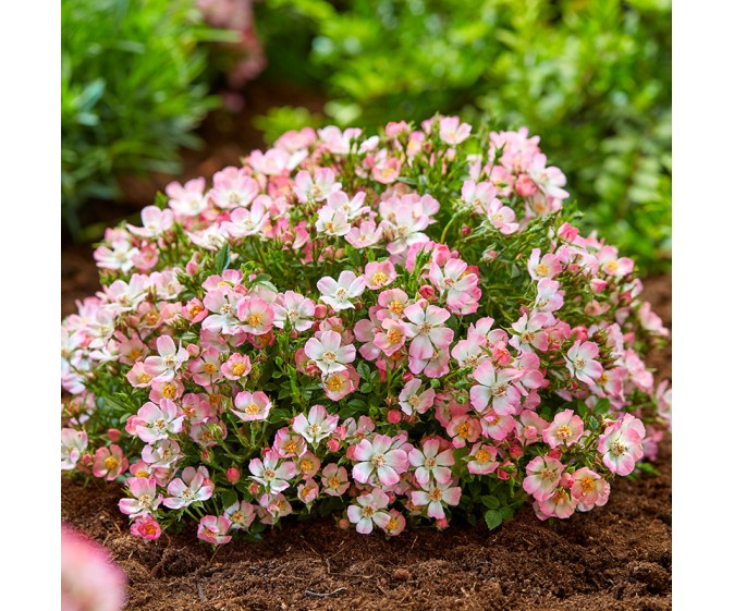To bardzo młoda, wyjątkowo urocza odmiana o gęstym, poduchowatym pokroju. Dorasta zaledwie do 15 cm wysokości, dzięki czemu idealnie sprawdza się w kompozycjach w pojemnikach, na balkonach i tarasach. Roślina kwitnie bardzo obficie, pokrywając się uroczymi, biało-różowymi kwiatami, które tworzą efektowną, słodką „chmurkę” kolorów. Dodatkowym atutem są pędy pozbawione kolców, co zwiększa komfort uprawy i pielęgnacji. To idealny wybór dla osób, które szukają małej, dekoracyjnej róży o dużym efekcie wizualnym i nowoczesnym charakterze.