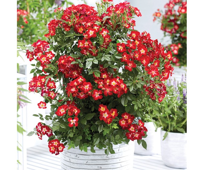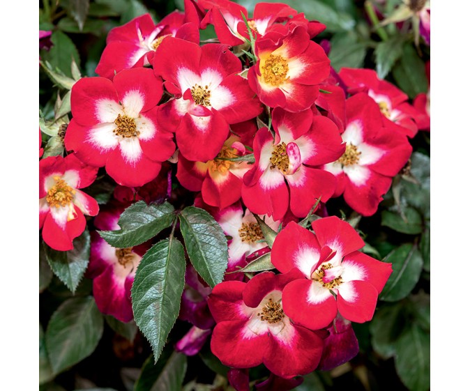 Róża rabatowa Everglow Ruby® to nowa, kompaktowa i niezwykle dekoracyjna odmiana, która przyciąga wzrok efektowną, kontrastową kolorystyką kwiatów. Zwarty, gęsty i dobrze rozkrzewiony krzew obficie obsypuje się niewielkimi, rubinowoczerwonymi kwiatami z jasnym, białym środkiem. Nie wymaga usuwania przekwitłych kwiatów, co czyni ją wyjątkowo łatwą w pielęgnacji. Doskonale sprawdzi się zarówno na rabatach, jak i w pojemnikach, wnosząc do ogrodu intensywny kolor przez cały sezon.