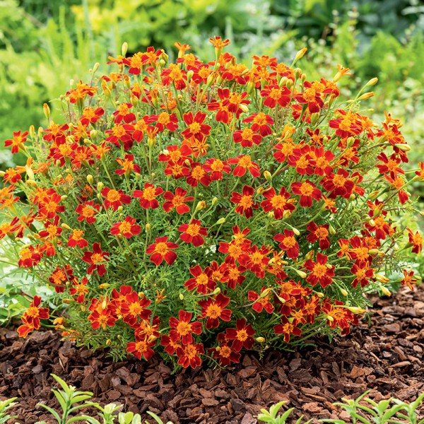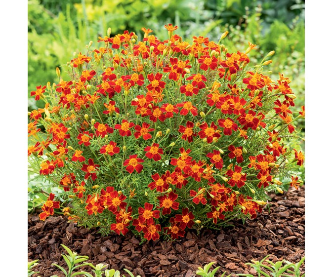 Aksamitka wąskolistna Red Gem (Tagetes tenuifolia) to wyjątkowa odmiana ceniona za bardzo obfite i długotrwałe kwitnienie. Roślina tworzy piękne, kwiatowe kobierce, które do przymrozków zdobią rabaty, kwietniki oraz pojemniki na balkonach i tarasach, wprowadzając intensywne, czerwone akcenty do ogrodu. Dodatkowo zapach aksamitki działa naturalnie odstraszająco na nicienie i drobne gryzonie, co czyni ją nie tylko dekoracyjną, ale i praktyczną rośliną w ogrodzie.