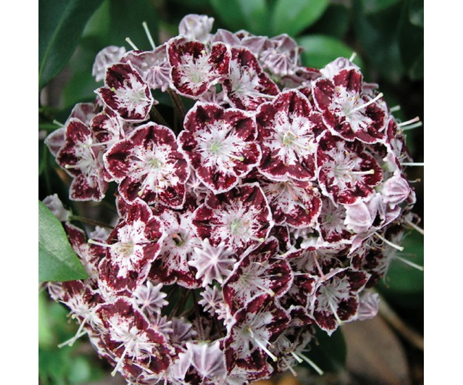 Kalmia szerokolistna Ufo (Kalmia latifolia) to dekoracyjny, zimozielony krzew o zwartym i kompaktowym pokroju, który wyróżnia się obfitym kwitnieniem. Kwiaty o średnicy około 3 cm, z efektownym bordowym pierścieniem, zebrane są w imponujące, wiechowate kwiatostany, tworząc wyjątkowy akcent w ogrodzie. Roślina jest mrozoodporna i doskonale sprawdza się jako ozdoba rabat, skalniaków czy pojemników, łącząc elegancję z trwałością przez cały sezon.