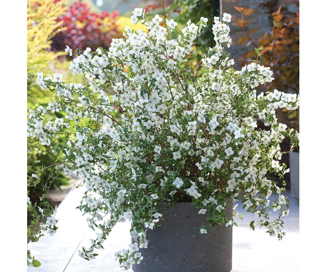 Jaśminowiec Petite Perfume White PBR (Philadelphus) to kompaktowy, niski i łatwy w pielęgnacji krzew, który oczarowuje intensywnym, słodkim zapachem kwiatów. Obficie kwitnąca roślina przyciąga motyle i pięknie prezentuje się zarówno w małych ogrodach, jak i w pojemnikach na balkonach. To idealny wybór dla osób szukających efektownej, pachnącej dekoracji, która łączy walory zapachowe z atrakcyjnym, kompaktowym pokrojem.